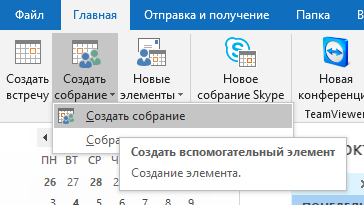 1) Для того, чтобы назначить митинг в Outlook, необходимо во вкладке Главная, раздела Календаря, выбрать Создать собрание.