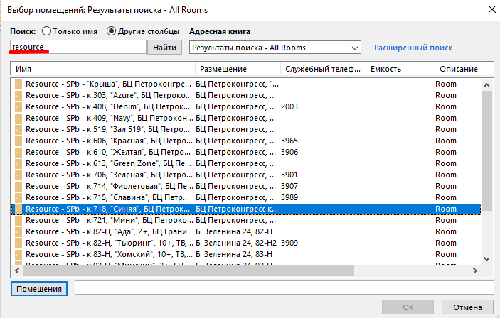 3) В строку Место, нужно выбрать помещение проведения собрания. Нажимаем кнопку Помещения и осуществляем поиск переговорки по слову Resource.