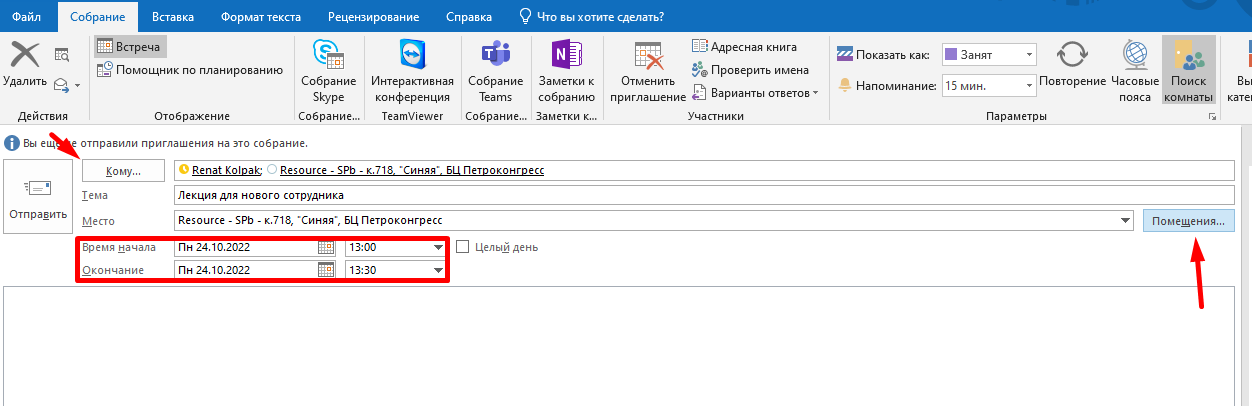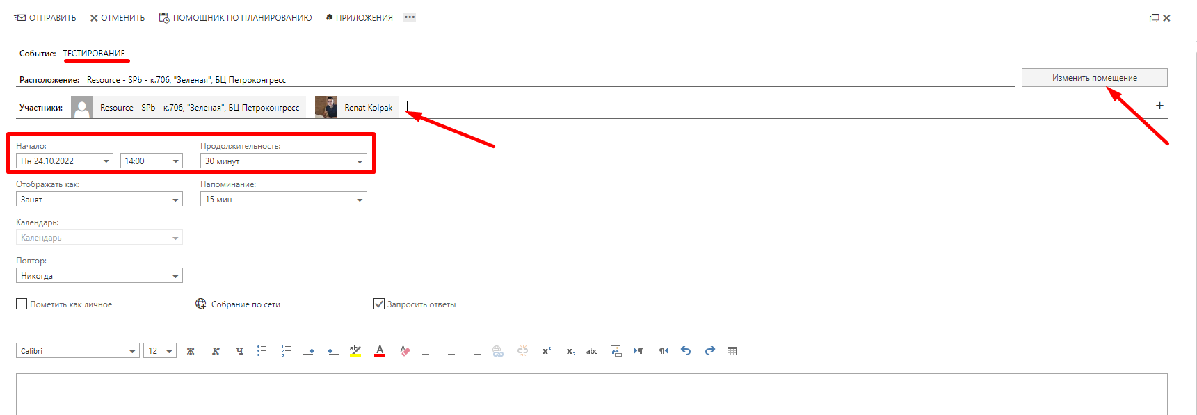 3) В строке Расположения, нужно выбрать помещение проведения собрания. Нажимаем кнопку Изменить помещение и осуществляем поиск переговорки по слову Resource.
