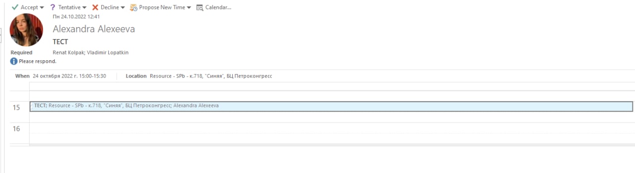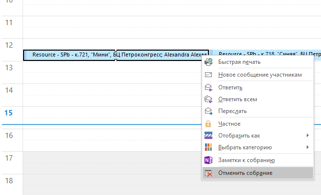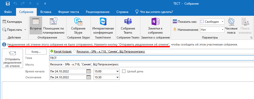 ❗️ Обязательно проверьте выполнение этого условия: Переговорка должна присутствовать в поле Участники. Наличие переговорки только в поле Место для брони недостаточно.