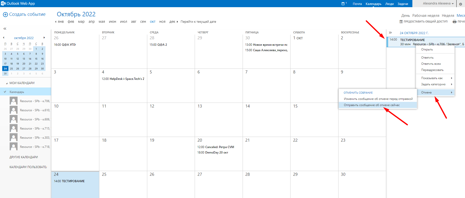 Для того чтобы отменить митинг, нужно найти данное событие в своём календаре, нажать пкм и Удалить собрание.