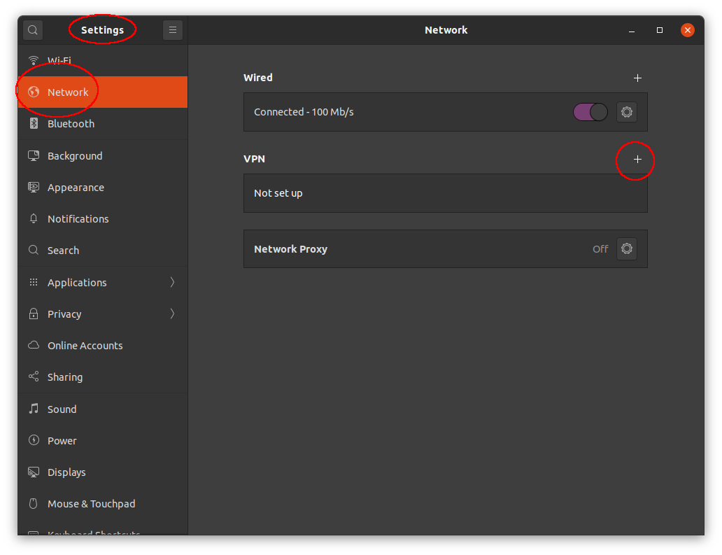 4) Открыть "Настройки", секцию "Сеть", нажать плюс в разделе VPN:
