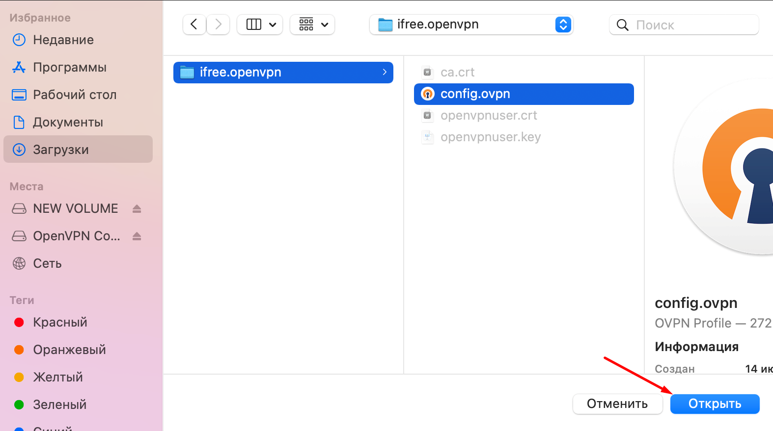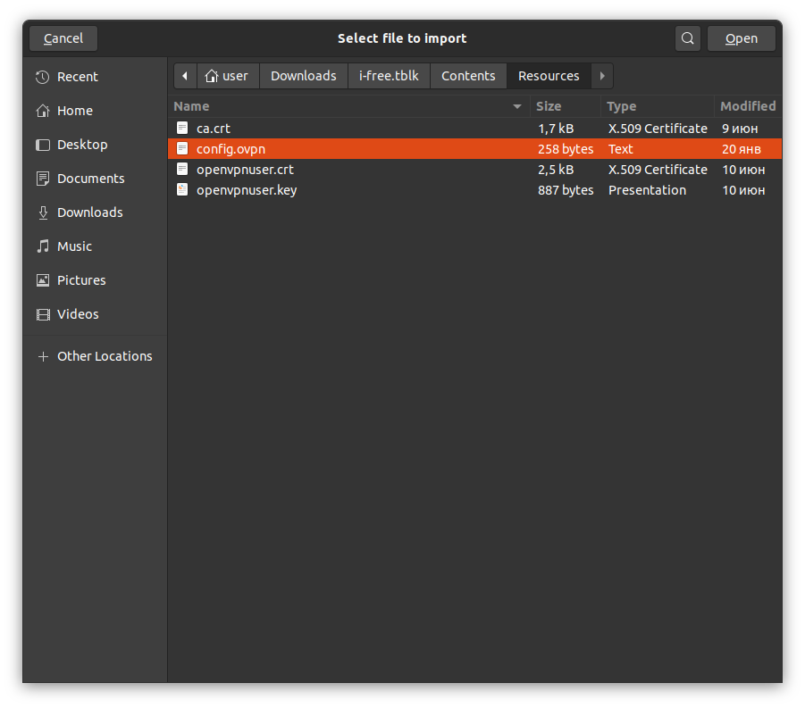 В папке загрузок найти скачанный выше файл подключения, зайти в него, выбрать config.ovpn, нажать "Open".