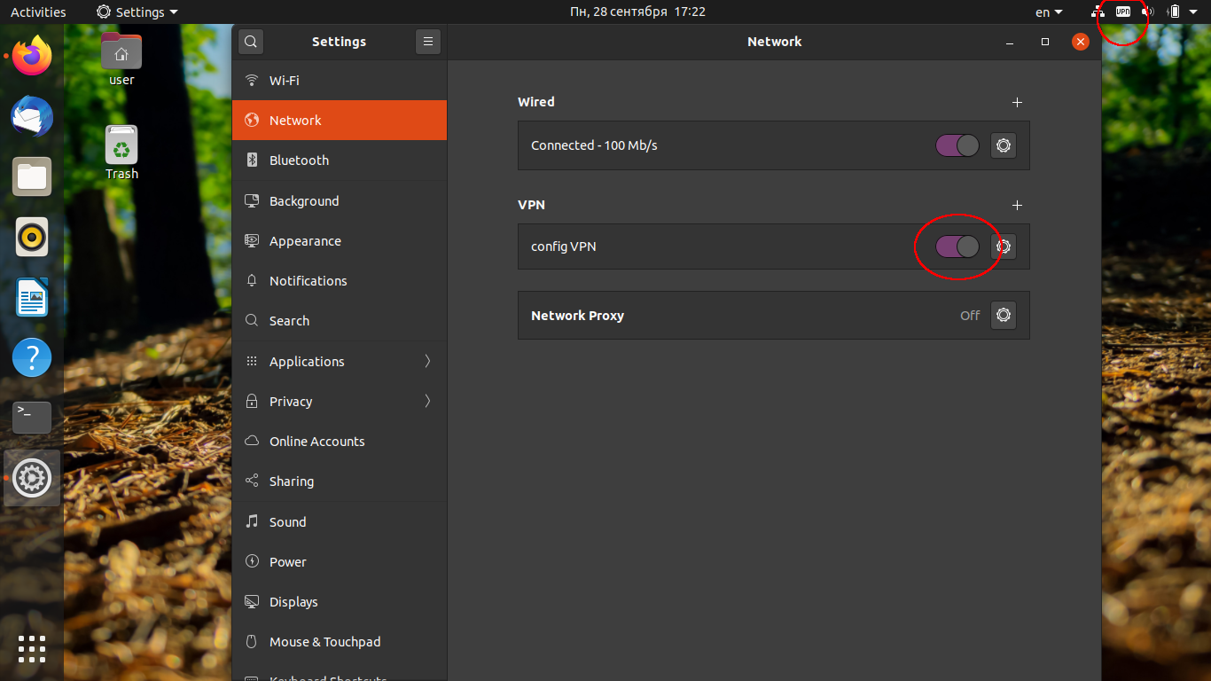 Об успехе можно судить по значку VPN в правом верхнем углу системы.