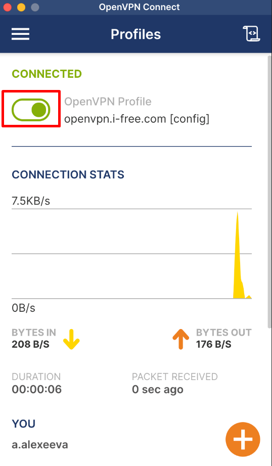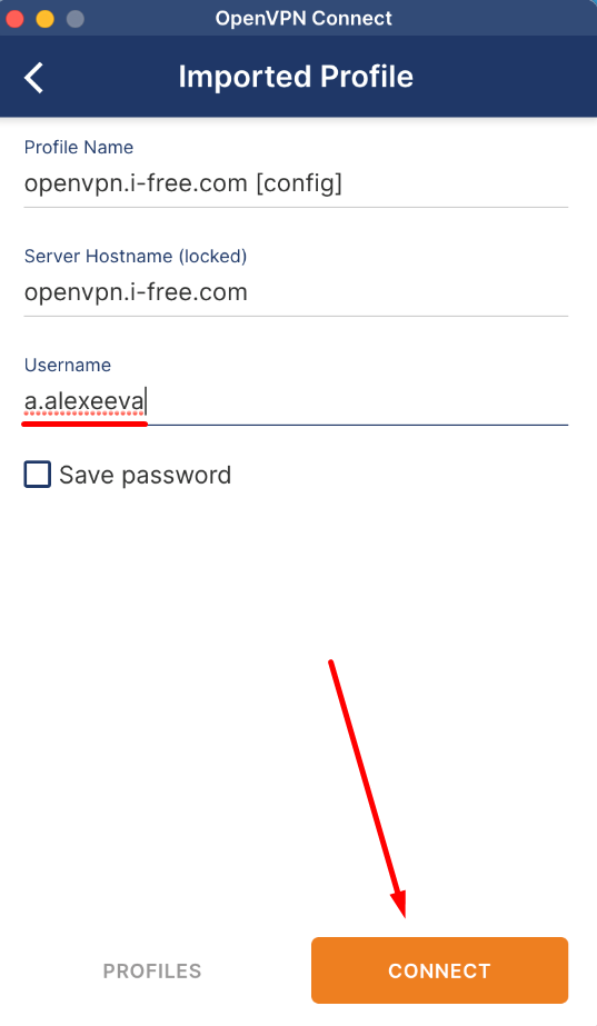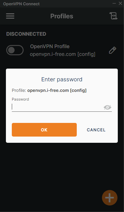 В окне VPN-клиента слева от созданного профиля нажать на тумблер, ввести пароль от своей учетной записи, нажать "Ok".