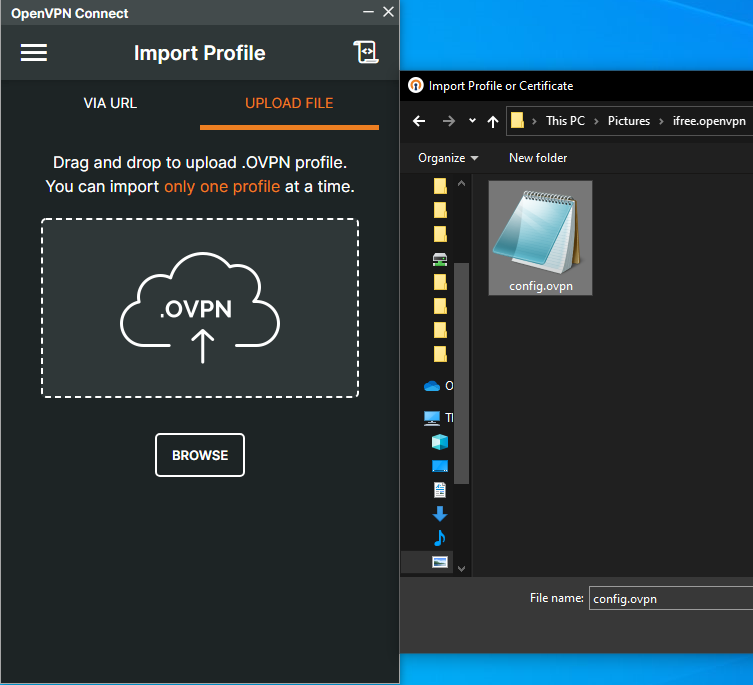 6) Выбрать config.ovpn, зайдя в скачанную в начале папку.