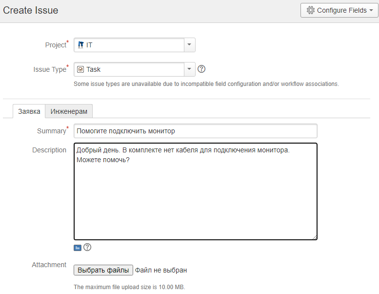 Кликаем кнопку Создать заявку в главном меню. Описываем кратко тему заявки, подробное описание, при необходимости прикрепляем вложение.